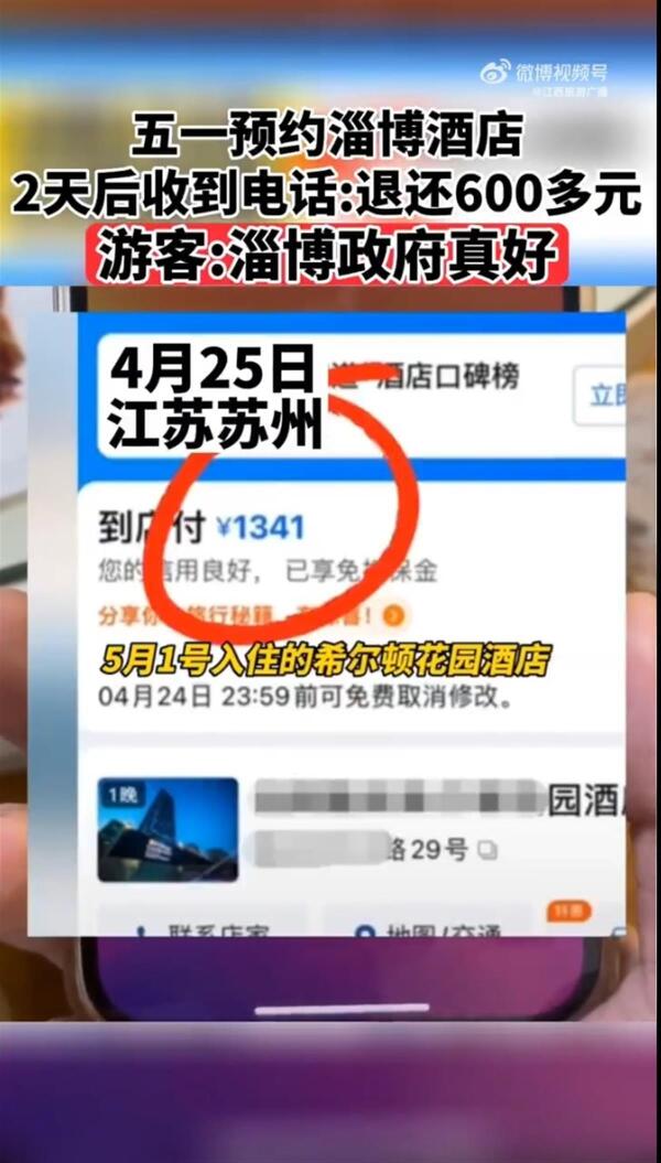 据铁骥视频4月25日报道:游客周先生预订了五一淄博的酒店,房价1341元,两天后被通知降低600多元,只需要支持735元即可,酒店工作人员称降价是因为政府限价。周先生表示,五一黄金旺季,降价600多元,差不多打对折了,而有的地方都是让退订涨价的。“淄博政府真好!”周先生感谢道。