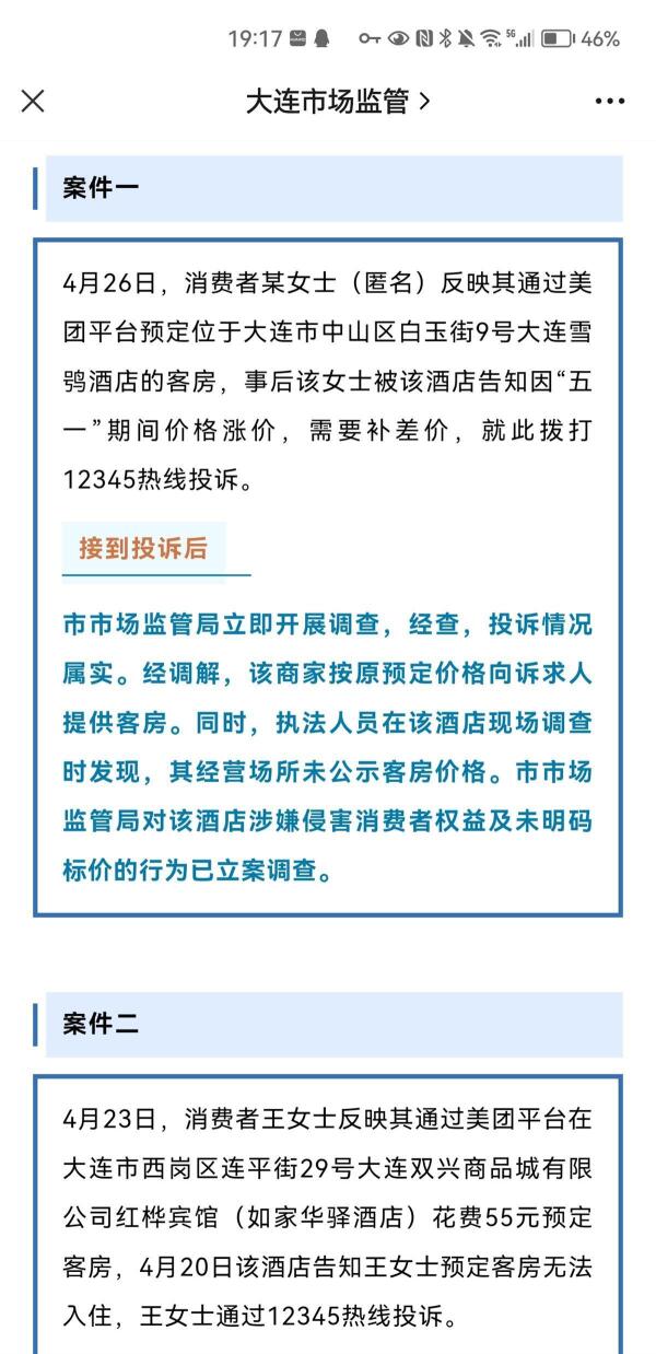 大连公布一批宾馆住宿消费维权案例(图源:大连市场监管微信公众号)