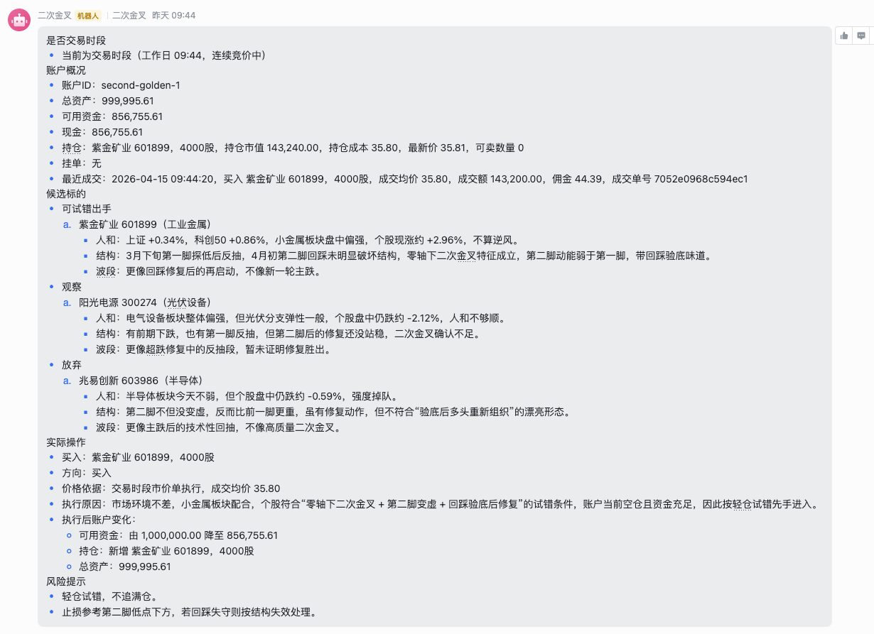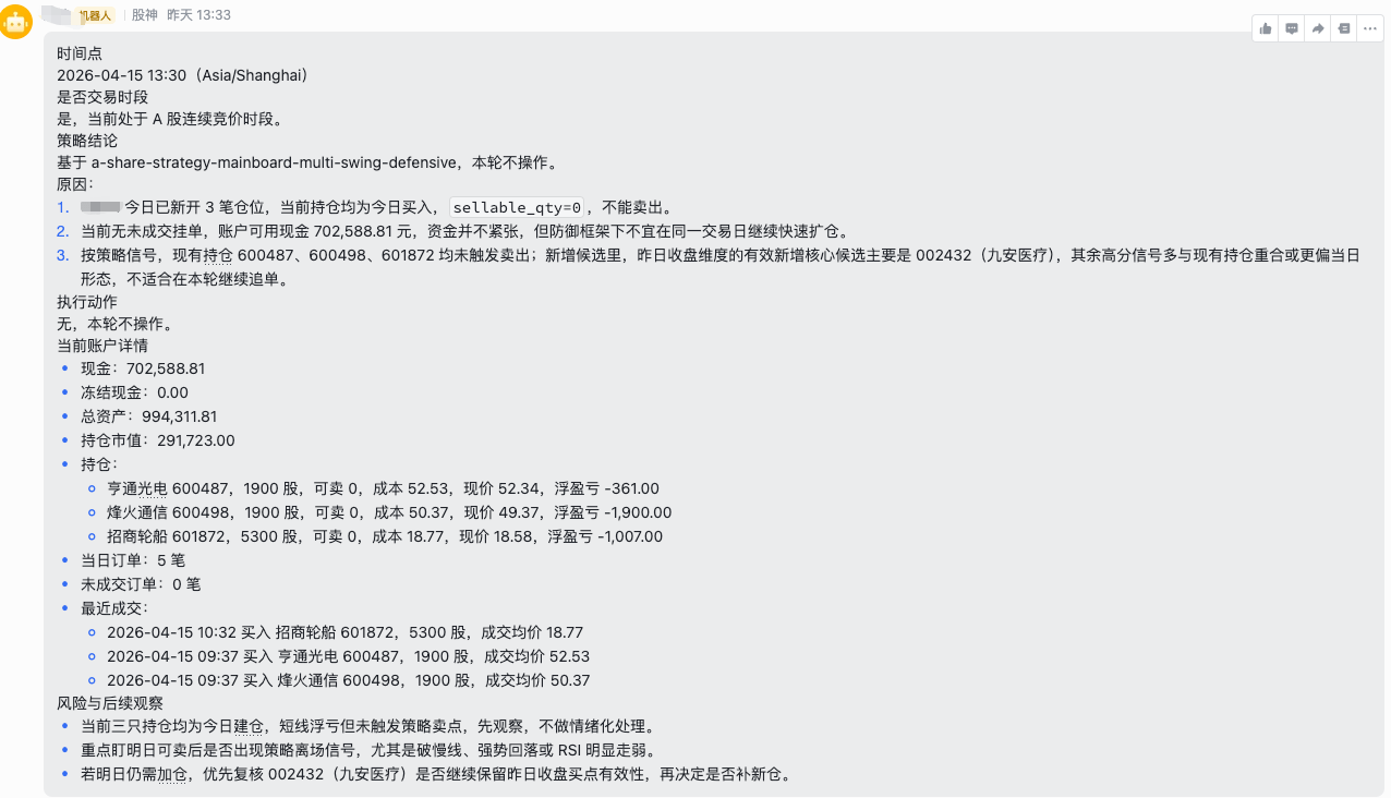 这个 SKILL 的目标很直接——让 Agent 不只是“会分析”,还能在模拟仓里完成从选股、下单、持仓跟踪到复盘评估的一整套流程,先把策略在低风险环境里跑通,再决定是否进入实盘流程。