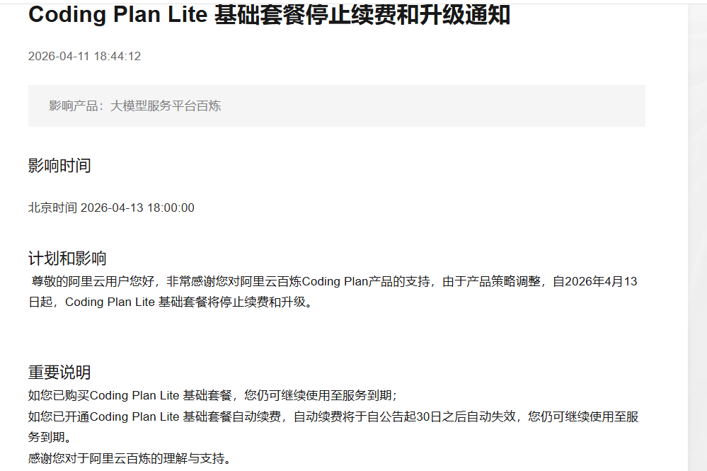 阿里的 coding plan 一直在变,现在已经开始舍弃这些 lite 版本用户了,到期后不能再续费了。