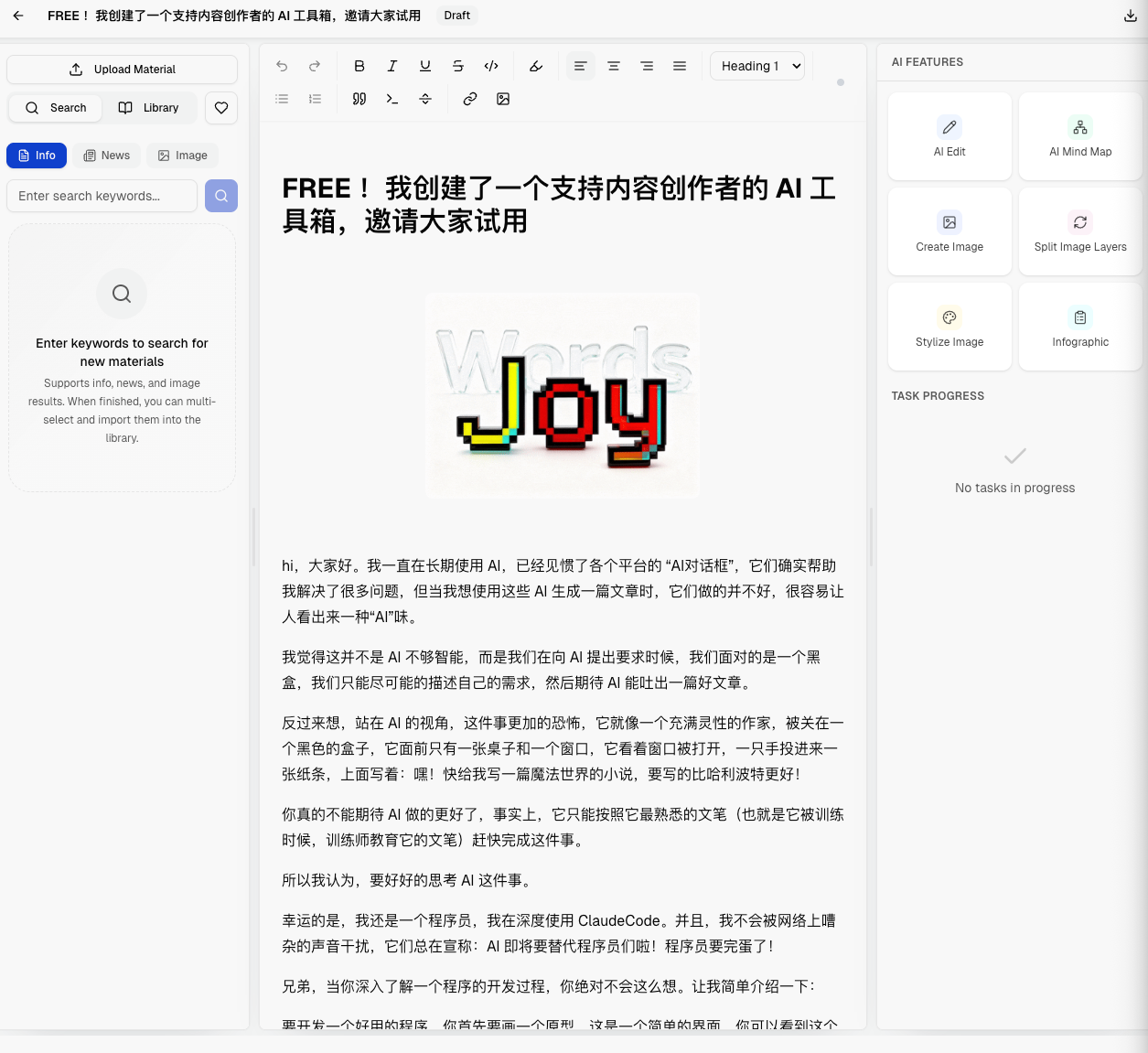 所以我做了这个 JoyfulWords。 在富文本编辑器的基础上,我增加了左侧的全网素材搜索🔍。这样我可以在写文章时候随时搜索素材,甚至图片,而不用离开编辑器。 在右侧,我集成了 AI 功能,AI 可以帮我修改文章、可以帮我生成思维导图、可以随时创作一张图片。 最重要的是,可以随时生成信息图,利用 nanobanana 的强大能力,自动把文本中的关键信息提炼成图,再也不用担心配图了。 欢迎大家使用和提出意见 界面截图: