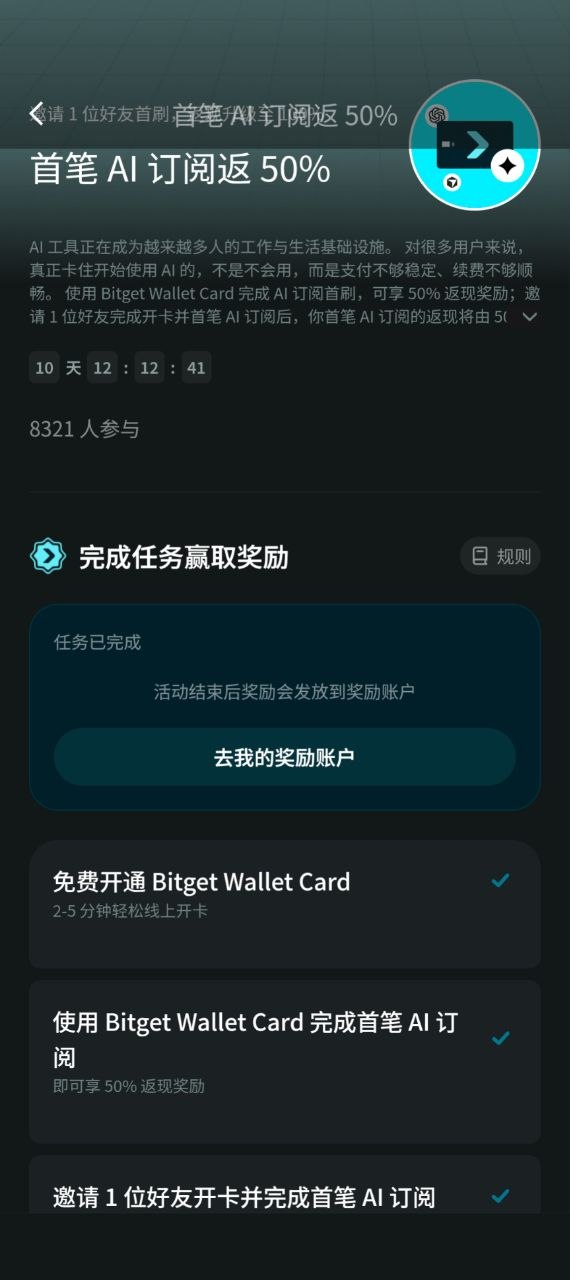 app 名称:Bitget Wallet 充值 AI 订阅首笔返现 50%,4 月 30 号结束。不需要海外地址,不需要海外的手机号,只需要有一张护照就可以。 注意在申请认证的时候,不要上网代理,避免认证的时候,IP 、手机号、护照不在同一地区。默认选择中国大陆即可