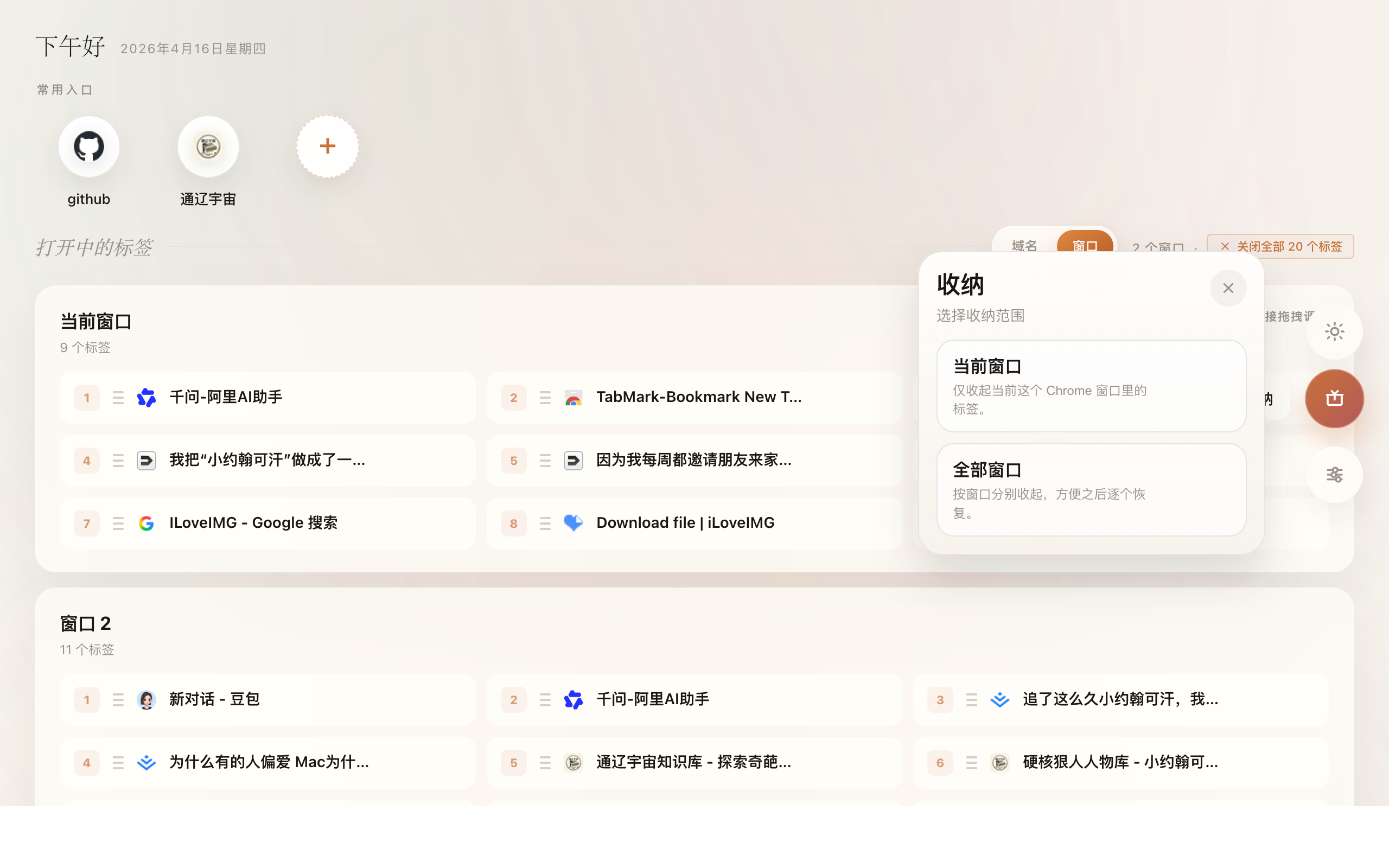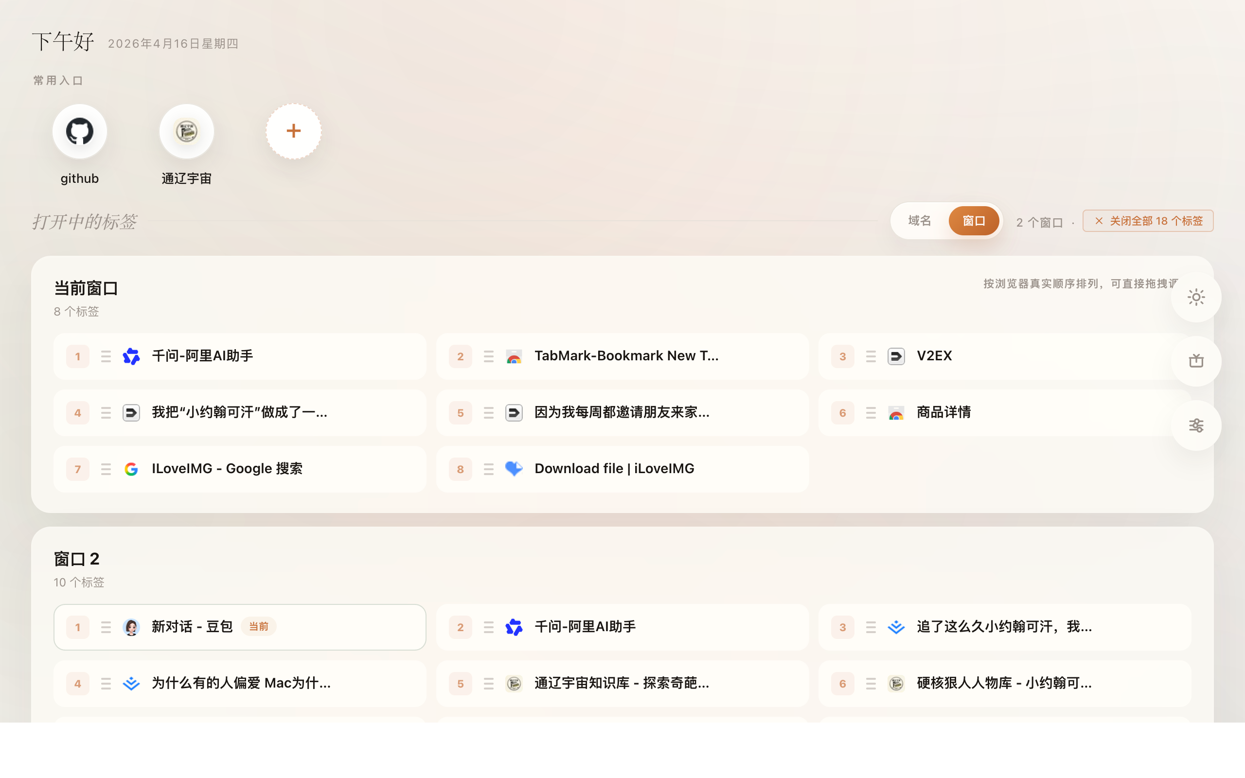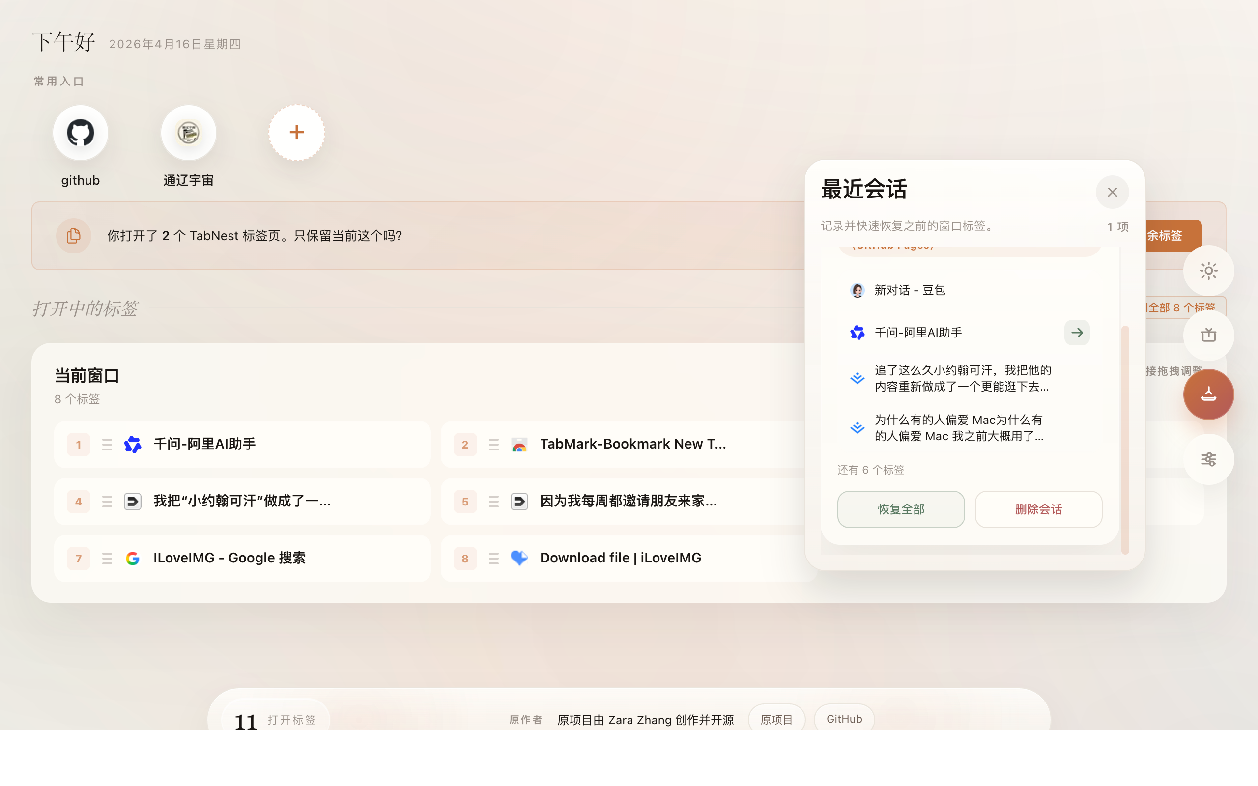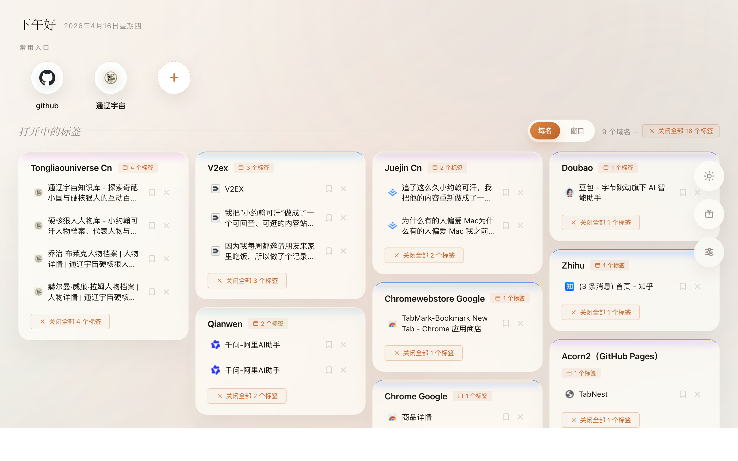最初的开源项目 tab-out,原作者就是因为自己会一下子打开 50 多个标签页,关闭起来很麻烦,所以做了这个工具。这个出发点我非常认同,所以我基于原项目继续做了二次开发,在保留原始思路的基础上,补充了更多适合日常使用的功能,形成了现在的 TabNest。