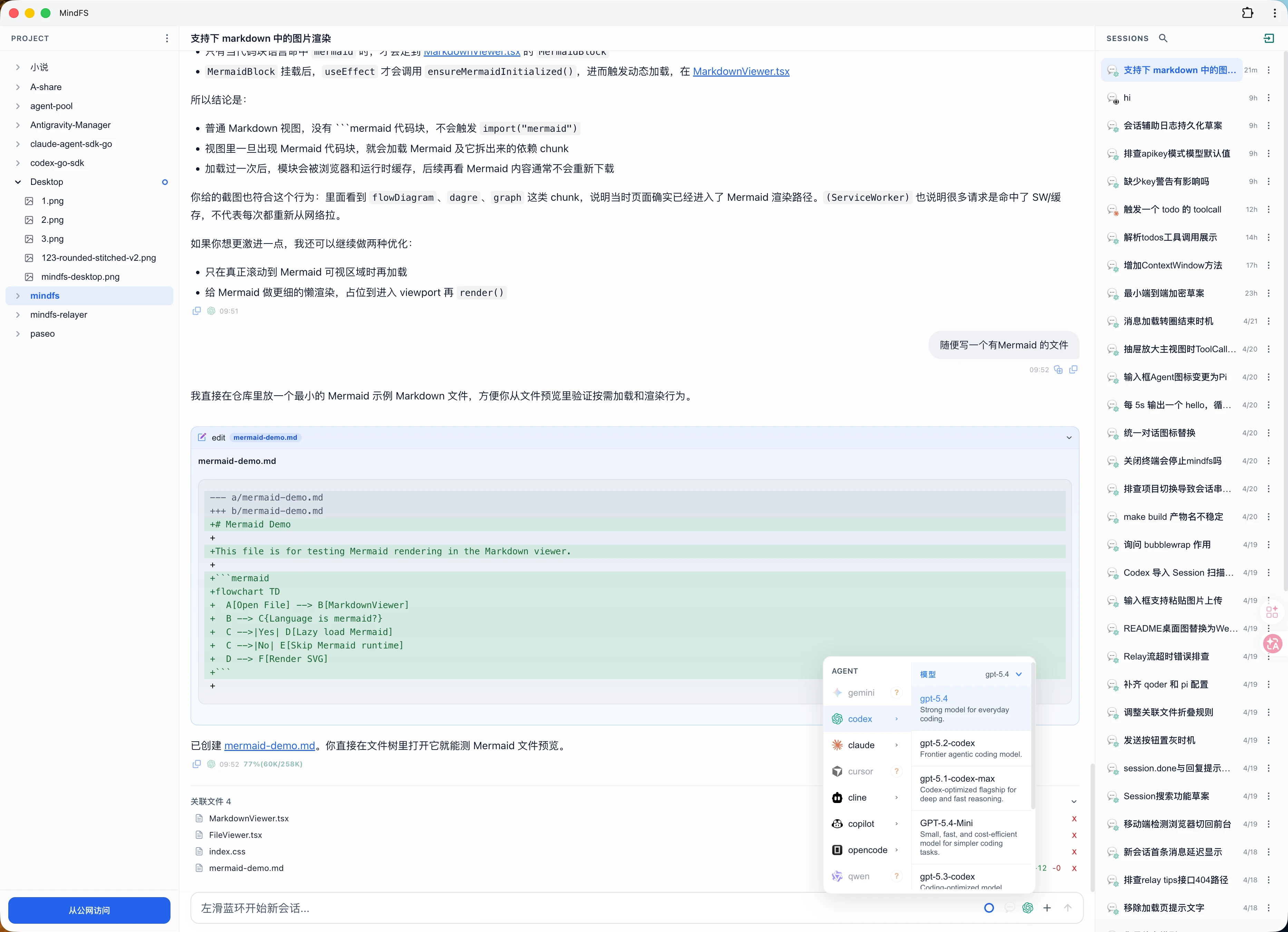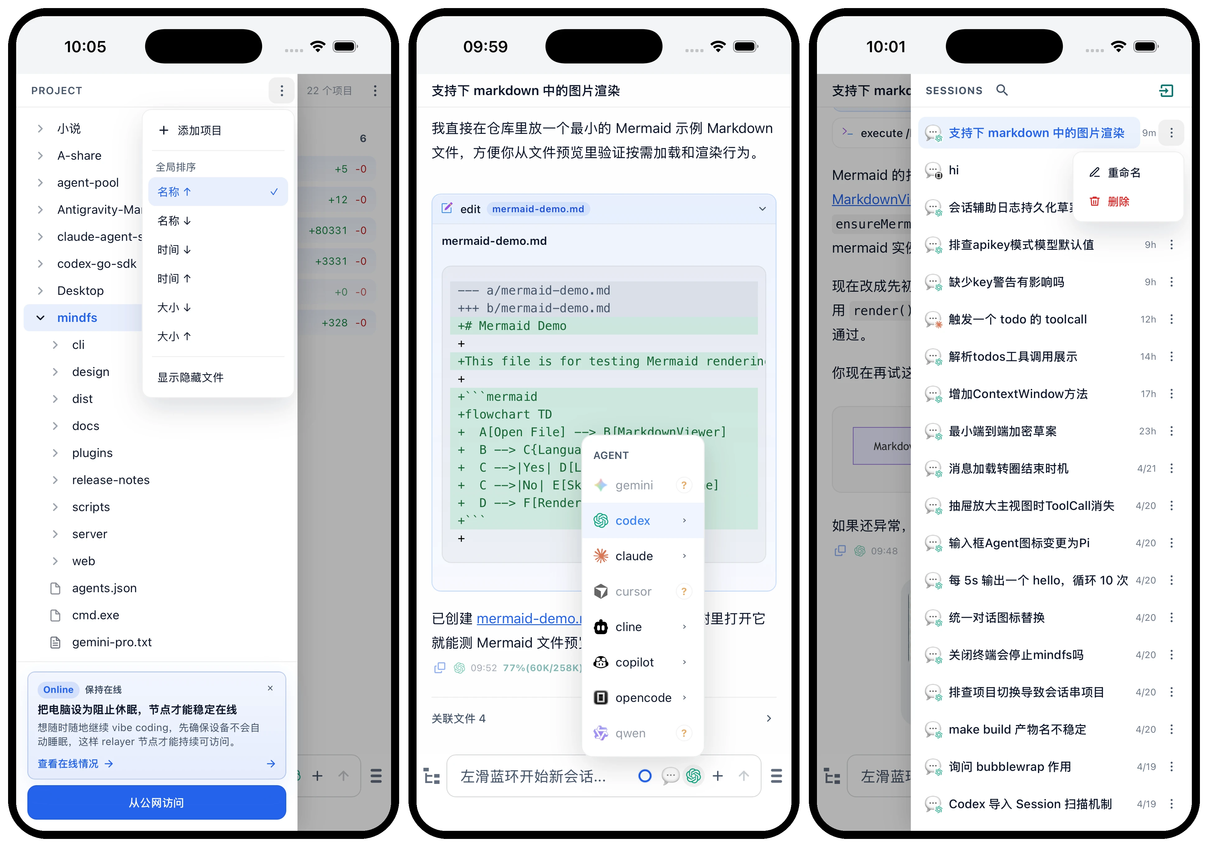 https://github.com/a9gent/mindfs.git 界面预览 特性 Agent 会话 多 Agent 支持:Claude Code · OpenAI Codex · Gemini CLI · Cursor · GitHub Copilot · Cline · Augment · Kimi · Kiro · Qwen · Qoder · Pi · OpenCode · OpenClaw ,自动探测已安装的 Agent 。实时流式输出:逐 token 推送,工具调用、思考过程、权限请求均以结构化卡片实时渲染,上下文窗口实时余量。灵活切换:会话中随时切换 Agent 或模型,多 Agent 共享同一上下文,无需重新描述背景。会话搜索:支持按会话标题或对话内容搜索,并可直接跳转到命中的会话和片段。外部会话双向导入:可浏览受支持 Agent CLI 的已有会话,选择后导入到 MindFS ,并作为原生 MindFS 会话继续使用,同时 MindFS 中的会话亦可在 cli 中恢复。绑定持久化与恢复:MindFS 会持久化内部会话与底层 Agent 会话的绑定关系,服务重启后可恢复该关联;后续消息在条件允许时会继续落到同一个 Agent 会话上。富媒体输入:支持在消息中直接附带文件和图片。多端同步:同一实例可同时在多个设备上访问,会话状态实时同步。 文件访问 多 Project:同时托管多个目录,会话按 Project 独立组织,互不干扰。数据自托管:所有对话历史、文件元数据、视图配置均存储在 Project 目录的 .mindfs/ 子目录下,迁移和备份只需复制目录本身。文件树浏览:完整的目录树导航,支持文件预览,Markdown 、图片、代码均有对应渲染器。 交互优化 / 斜杠命令:输入 / 触发命令候选列表,快速执行预设操作。@ 文件引用:输入 @ 触发文件路径补全,将任意文件作为上下文附件发送给 Agent 。# 快捷提示词:输入 # 触发已收藏的快截提示词输入。文件与会话双向跳转:打开文件可跳转到产生它的会话;打开会话可查看所有相关文件。浏览器应用( PWA ):可安装到桌面或手机主屏幕,体验更优。手机界面优化:底部操作栏拇指可及,界面更简洁。 访问模式 本地模式:服务启动后即可在局域网内通过浏览器访问,无需任何账号或配置。Relay 远程模式:无需开放防火墙端口,通过 relayer 从公网任意设备访问本地实例,实现随时随地的 agent 访问。(本地模式页面中点击绑定按钮)私有通道:通过私有通道( tailscale 等),直接通过 ip:port 访问。端到端加密:会话、文件支持端到端加密保护。 插件系统 定制视图:插件是一种针对文件的定制视图,按照「传入文件内容 → 解析 → 渲染界面」的框架运行。Agent 生成插件:向 Agent 发送「实现一个 txt 小说阅读器」,Agent 即可生成对应插件,此后所有 txt 文件将以小说阅读方式呈现。交互闭环:实现「定制插件 → 浏览文件 → Agent 交互」的完整闭环。 安装运行 单二进制:生产构建是一个静态编译的单二进制文件,内嵌所有 Web 资源,安装包小于 10M 。零依赖:宿主机无需安装 Node.js 、Docker 或任何守护进程管理器。多平台:支持 macOS ( Intel + Apple Silicon )、Linux ( x86-64 、ARM64 、ARMv7 )、Windows ( x86-64 、ARM64 )。 agent, 同步, 文件