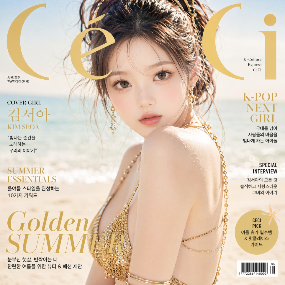 엄청 인형같은 얼굴의 K팝 여자 아이돌이 금색 여름 해변 의상을 입고 한국 잡지 표지 모델을 장식한 모습을 표현. 표지 문구에는 아이돌에 대한 소개 글이 들어가도록 표현. 아이돌의 이름은 여성스러운 이름으로 표현.