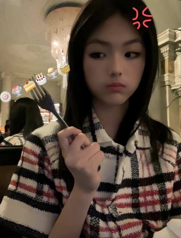 第一张照片是王诗龄拿着叉子对着镜头,虽然美颜和化妆有些过头,但看眉眼也能认出这是当年那个胖胖的小姑娘王诗龄。