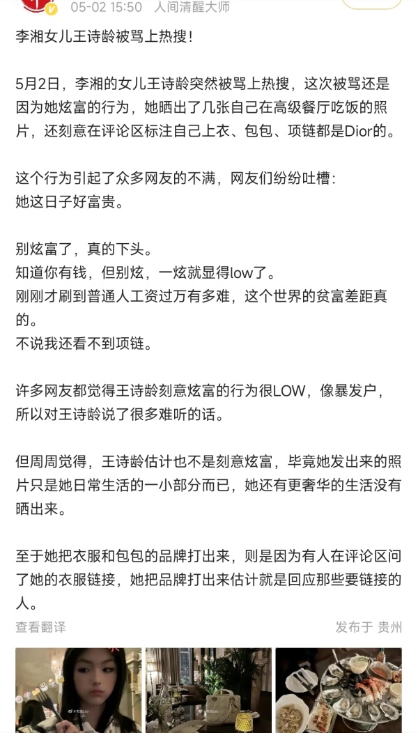 5月2日,知名女主持人李湘的女儿王诗龄在个人账号上分享一段自己在某高级餐厅吃饭的照片,其中因为在评论区里刻意炫耀自己的一身名牌,遭到了网友的吐槽。
