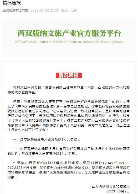 导读:针对近日网民反映“游客不买东西被导游辱骂”问题,云南西双版纳通报称对辱骂游客当事人姜某罚款1万元;涉事旅行社吊销许可证,直接责任人罚款2万元。