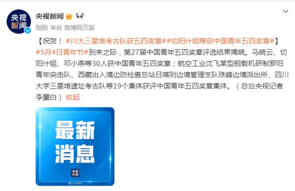 【祝贺! 川大三星堆考古队获五四奖章 切阳什姐等获中国青年五四奖章】5月4日青年节到来之际,第27届中国青年五四奖章评选结果揭晓。马晓云、切阳什姐、邓小燕等30人获中国青年五四奖章;航空工业沈飞某型舰载机研制罗阳青年突击队、西藏出入境边防检查总站日喀则边境管理支队珠峰边境派出所、四川大学三星堆遗址考古队等19个集体获评中国青年五四奖章集体。(总台央视记者李墨白)