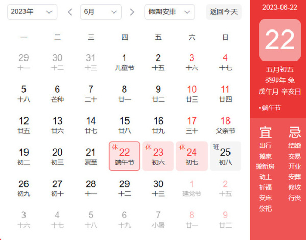 导读:今年端午节是6月22日,国家规定的假期是3天,22日到24日放假,25日(周日)补班。由此一来,端午节假期后需连上6天班。