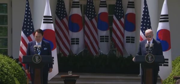 拜登(右)与尹锡悦(左)当地时间4月26日共同参加记者会的画面。图源:美媒视频截图