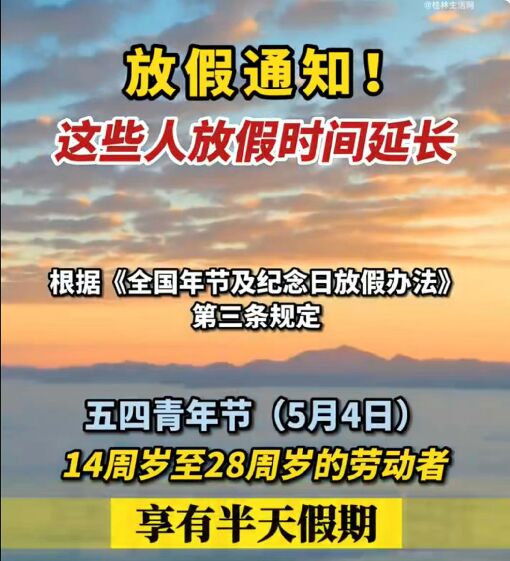 国务院出台的《全国年节及纪念日放假办法》第三条规定了部分公民放假的节日,其中第二点写明:青年节(5月4日),14周岁以上的青年放假半天。不过如果适逢周六、日,不补假。至于是上午还是下午放假并未作硬性规定,由各单位视情况而定。