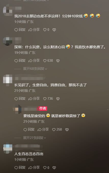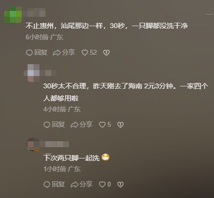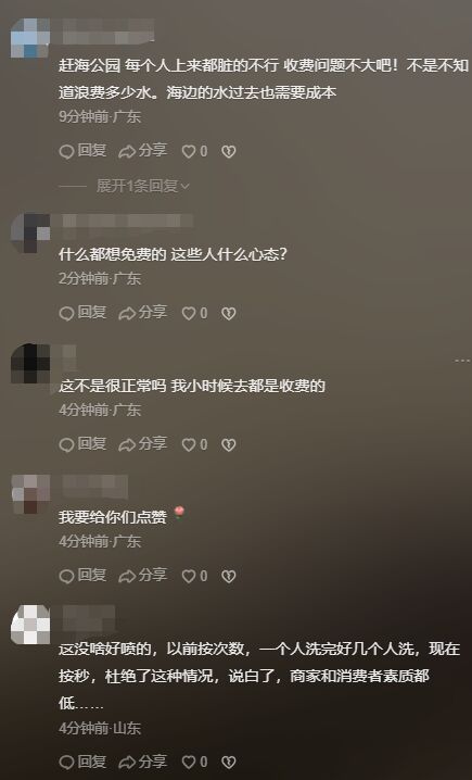 该条视频引发许多网友关注。不少网友表示都有过此类遭遇,“我2018去那边也差不多这样!5分钟10块钱”,“不止惠州,汕尾那边一样,30秒,一只脚都没洗干净”……还有网友表示,“长见识了,生意自由,消费自由,那我不去了。”发布视频的游客称,“要钱是接受的,就是被秒数震惊了。”也有不少网友表示理解,“赶海公园每个人上来都脏得不行,收费问题不大吧!不知道浪费了多少水,海边的水过去也需要成本。”
