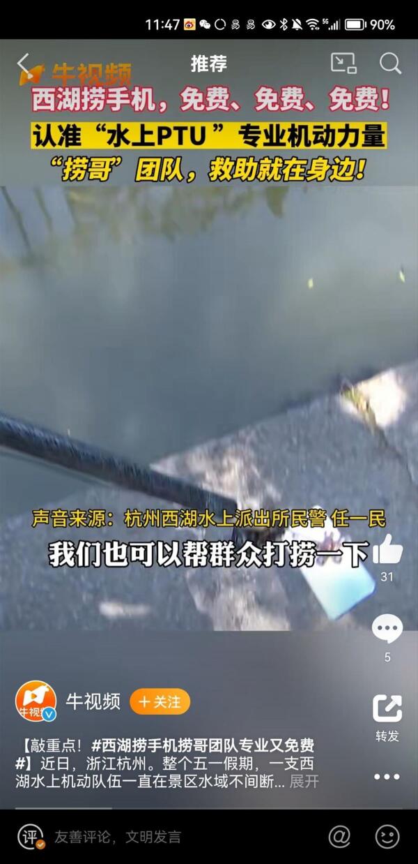 “不要以为捞手机都是要收费的。”西湖水上派出所民警强调说。对此,网友纷纷点赞:请认准专业力量,免费又靠谱。