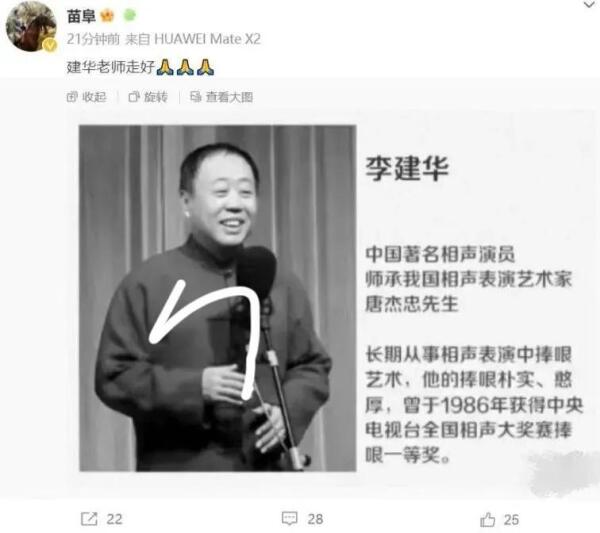同为相声演员的苗阜很快在社交平台发布了一条动态,写下文字:“建华老师一路走好。”