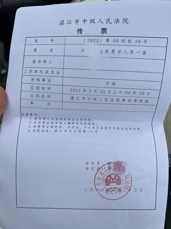 5月22日,黄某南犯故意杀人罪一案将在湛江中院开庭审理。受访者供图