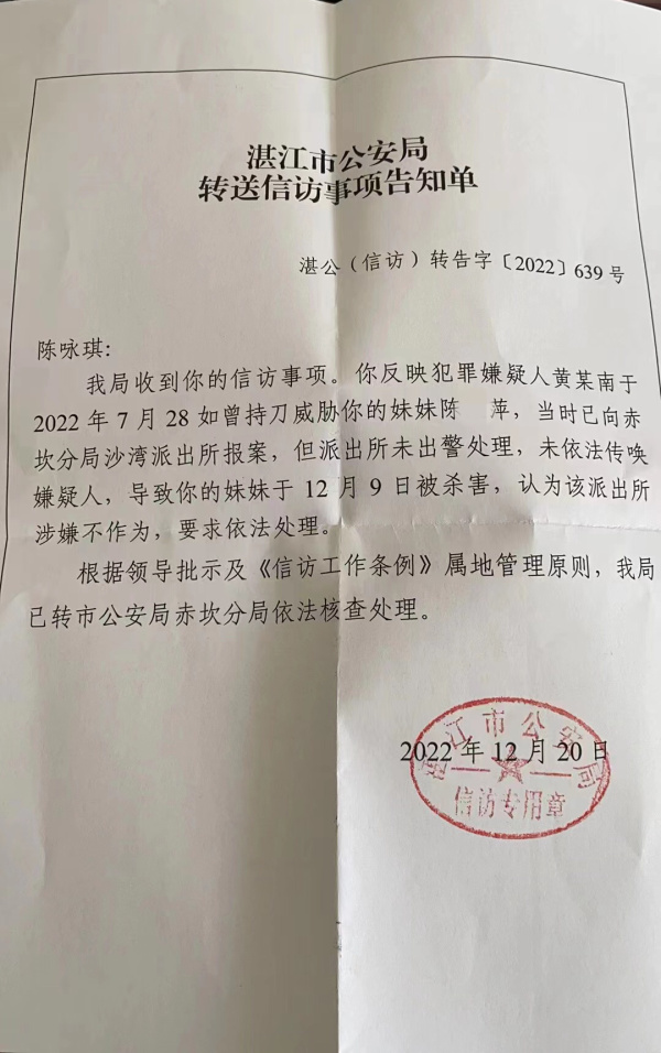 认为警方不作为,陈某萍的家人曾向相关部门信访举报。2022年12月20日,湛江市公安局答复称,已转湛江市公安局赤坎分局核查处理。受访者供图