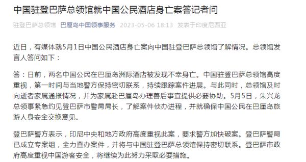 答:日前,两名中国公民在巴厘岛洲际酒店被发现不幸身亡。中国驻登巴萨总领馆高度重视,第一时间与当地警方保持密切联系,持续跟踪案件进展。与此同时,总领馆及时向逝者家属通报情况,并为家属赴巴厘岛办理善后事宜提供必要协助。5月5日,朱兴龙总领事紧急约见登巴萨市警局局长,了解案件侦办进程,并就确保中国公民在巴厘岛旅游人身安全交换意见。