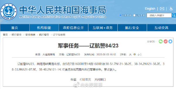 导读:据中国海事局网站消息,大连海事局发布航行警告,自5月7日16时至14日16时,渤海海峡黄海北部执行军事任务,禁止驶入。