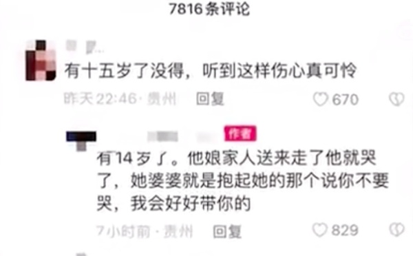 据视频发布者描述, 视频中女生被送到婆家后大哭,婆婆抱住她称会好好照顾她。有网友关心女生年龄,视频作者回复称女生14岁。