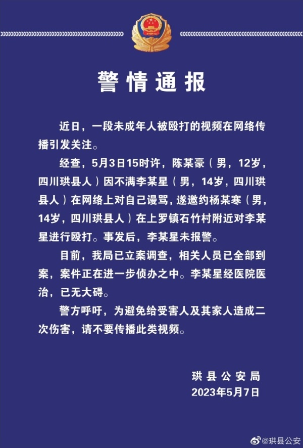 据@珙县公安 微博消息,珙县公安局5月7日发布警情通报称,近日,一段未成年人被殴打的视频在网络传播引发关注。