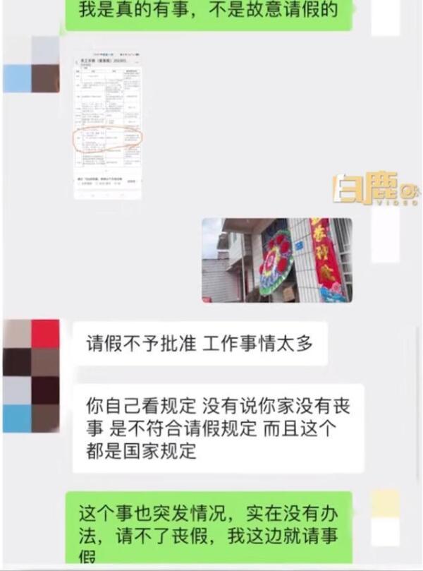 聊天截图显示,女子甚至拍下了办丧事的照片,但该领导还是态度强硬,不同意其请假要求。丧假和事假均不允许,并称涉及丧事不再和女子展开讨论。