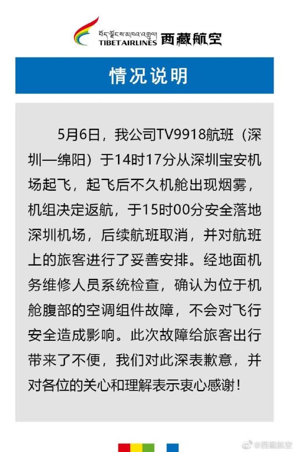 5月8日,@西藏航空 微博发布情况说明称,5月6日,该公司TV9918航班(深圳-绵阳)于14时17分从深圳宝安机场起飞,起飞后不久机舱出现烟雾,机组决定返航,于15时00分安全落地深圳机场,后续航班取消,并对航班上的旅客进行了妥善安排。