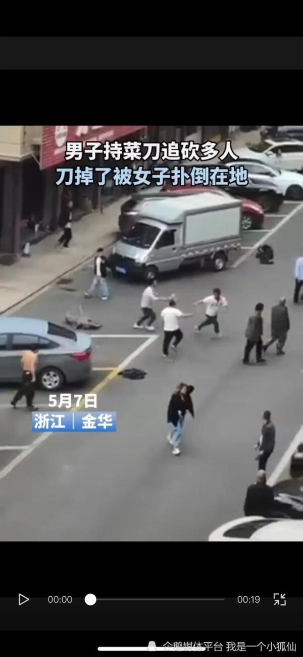 2023年5月7日,浙江金华东岩街发生了一起砍人事件,一名男子手持菜刀疯狂对着一名男子和一名女子进行追砍,现场能够清晰地听到喊叫之声。在男子行凶的过程中,菜刀掉到了地上,男子弯腰捡刀时,被黑衣女子从背后扑向他,将其扑倒在地制服。