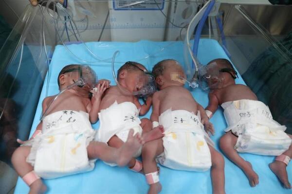 去年5月27日,怀孕近27周的郝女士出现宫缩,丈夫立即将她送入武汉那家医院,进行住院治疗和护理,成功避免早产。6月26日,怀孕31周的郝女士出现早产先兆,医院儿科、产科、麻醉科医护迅速集结,完成术前评估后,立即为她进行剖宫产手术。最终,26日上午,龙凤四胞胎顺利诞生,医生先将一名1.83公斤的女婴娩出,随后将三名男婴依次分娩,这三名男婴体重最大1.78公斤,最轻的1.5公斤。4名宝宝被立即放入转运温箱,送往儿科NICU(新生儿监护病房),后经过精心照料顺利出院回家。