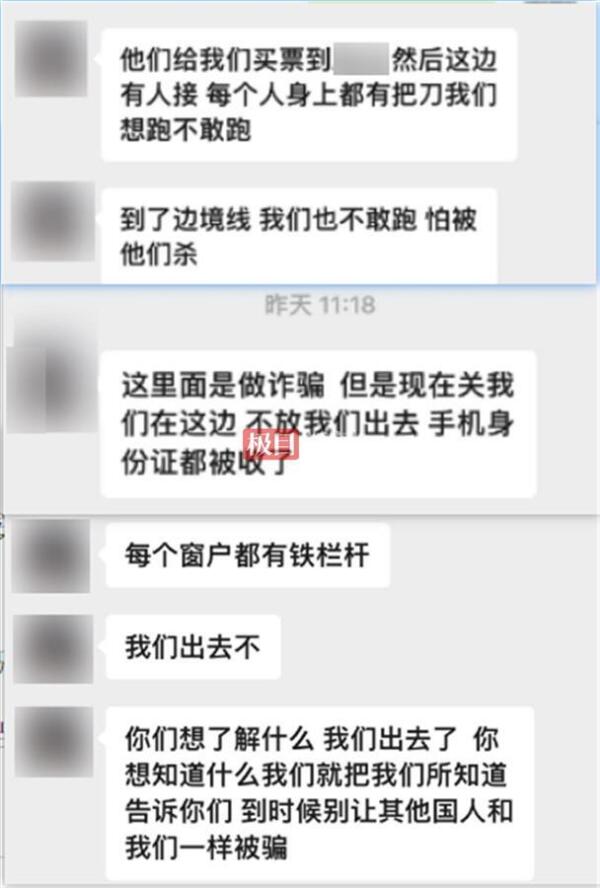 “他们给我说,过来打工吧,这边工资高,一个月能挣两三万元,而且他们还答应给我们买车票,另外路上的吃住费用也都是他们包,我们就傻乎乎地来了,见面后发现情况不对,可是想跑的时候已经晚了。”李某娇告诉极目新闻记者,见面后,对方就拿走了她的身份证,随后把她同其他几人带到了缅甸,“有人来接我们,他们每个人身上都有把刀,我们想跑不敢跑。”
