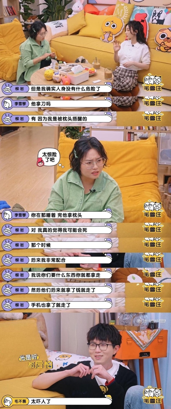 柳岩还透露自己是被枕头捂醒的,当时自己非常配合,对方拿了钱和手机就走了。“我真的觉得我可能会死,后来我非常配合。”