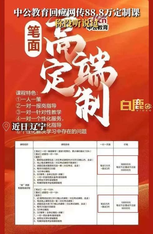 导读:近日,网传中公教育“笔面高端定制课”收费88.8万引发关注,有网友称“辽宁已有人报考该课程”。对此中公教育官网客服称,各个地市有自己的课程,具体不清楚。