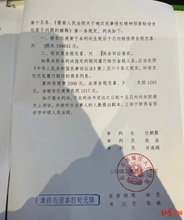 2023年5月8日,红星新闻从权威渠道获悉,因1900元租金引发20岁女大学生和70多岁房东骂战的致死案,一审判决已出炉:西安市新城区法院一审判决显示,房东任庚寅被判赔偿女大学生程培的父母194643元。