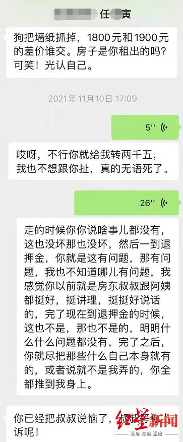 聊天记录还显示,任庚寅和程培在沟通中提到,“狗把墙纸抓掉”等“损失”和再转租房子的费用等问题,需要扣除些费用。最后,程培说,“叔,最低你给我退3000元,再不行我真的只能上法院了。”