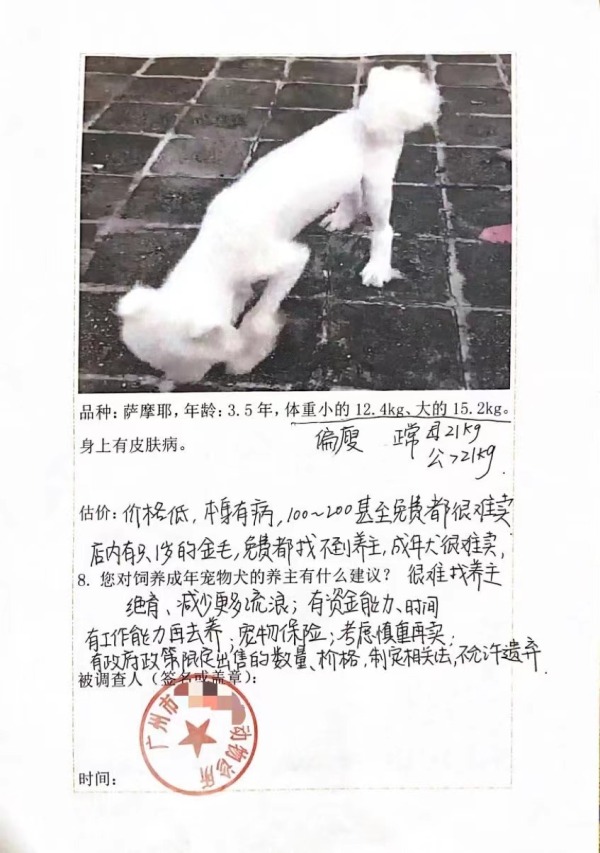 她也采访增城区多家宠物店、宠物医院,制作了一份《访谈笔录》。笔录中,受访对象均表示:成年犬不值钱,基本是免费找人领养。