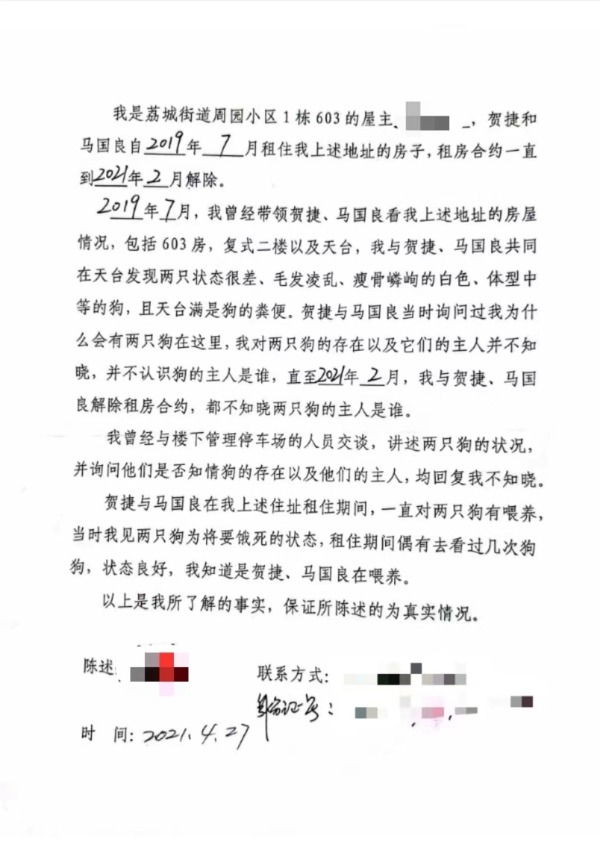 据陈文辉一审判决前的一份情况说明,签租房合同当天,他与贺捷、马国良一同在天台看过这两条“毛发凌乱、瘦骨嶙峋”的狗,当时夫妻俩问他,为什么会有两只狗在这里,他并不知情,直至解除租房合约,“都不知晓两只狗的主人是谁。”