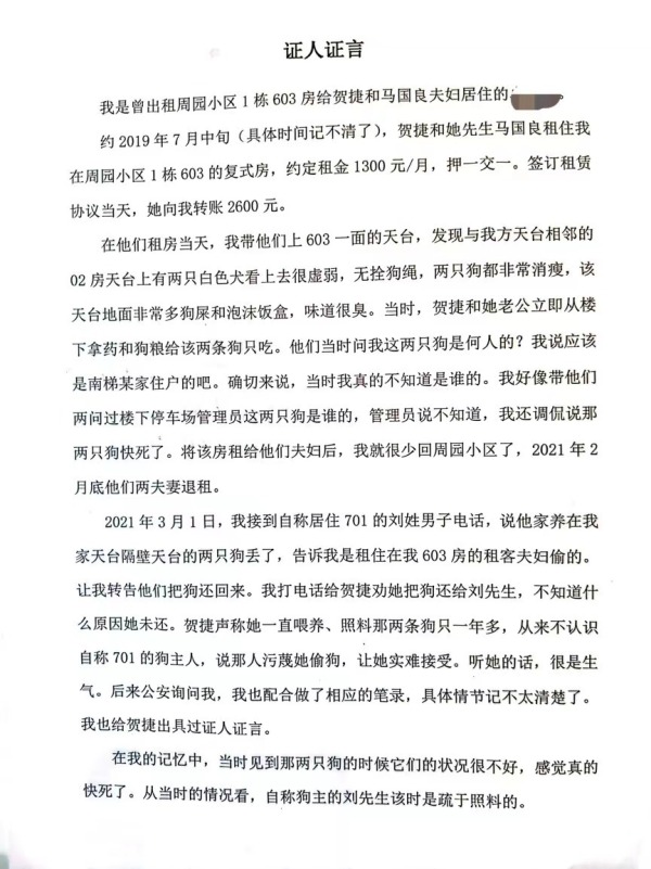 据一审判决书,房东陈文辉证言中,他将603租给贺捷、马国良当天,三人一同在天台看过两条狗,之后他们询问停车场管理员两条狗是谁的,对方回应说是1栋701房的住户的。