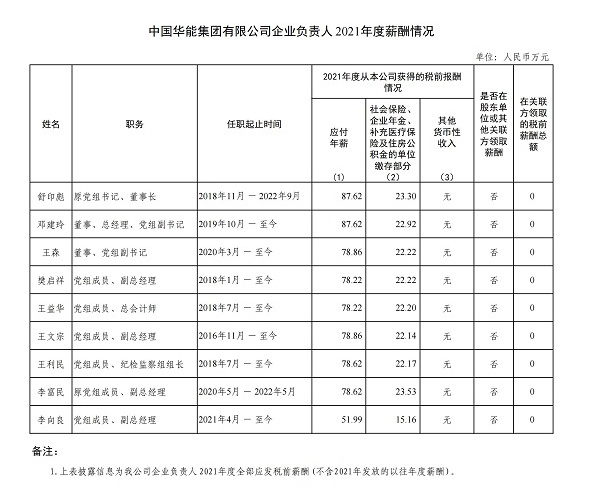 2023年1月28日,中国华能集团有限公司披露《中国华能集团有限公司企业负责人2021年度薪酬情况》。原党组书记、董事长舒印彪在2021年度从华能集团获得的税前应付年薪为87.62万元。