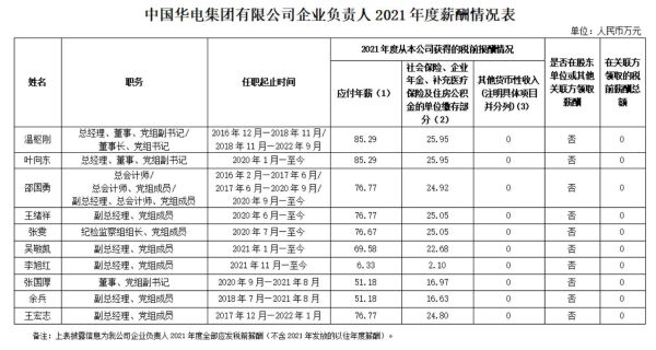 1月30日,中国华电集团公布企业负责人2021年度薪酬情况表。中国华电董事长、党组书记温枢刚年薪85.29万元。