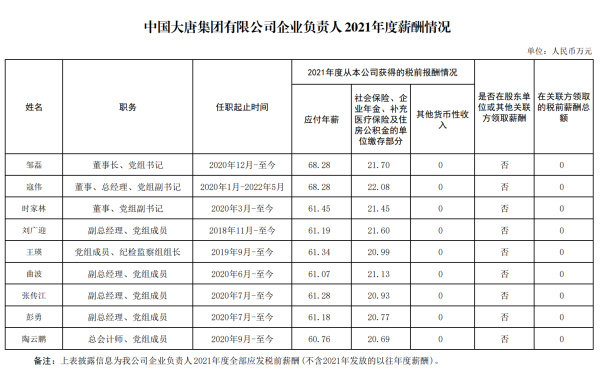 1月29日,中国大唐集团有限公司披露企业负责人2021年度薪酬情况。大唐集团董事长、党组书记邹磊年薪68.28万元。