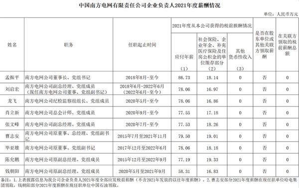 1月30日,中国南方电网有限责任公司披露企业负责人2021年度薪酬情况。南方电网董事长、党组书记孟振平年薪86.73万元。