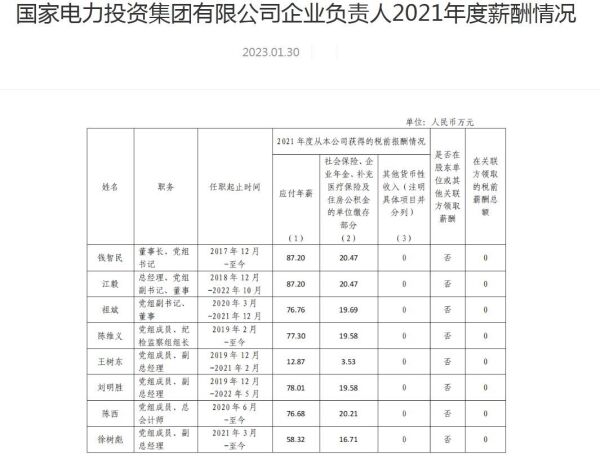 1月30日,国家电力投资集团有限公司披露企业负责人2021年度薪酬情况。国家电投董事长、党组书记钱智民年薪87.2万元。