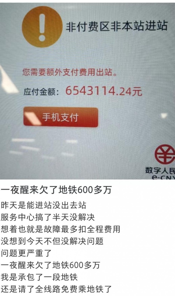 发布帖子的网友“默默无闻”IP显示为广东。其表示,自己7日是能进站不能出站,服务中心半天没解决,想着也就是故障最多扣全程费用,没想到8日非但没解决,问题更严重了,“一夜醒来欠了地铁600多万,我是承包了一段地铁,还是请全线路免费乘地铁了。”这位网友还晒出相关图片,图片显示其应付金额为6543114.24元。