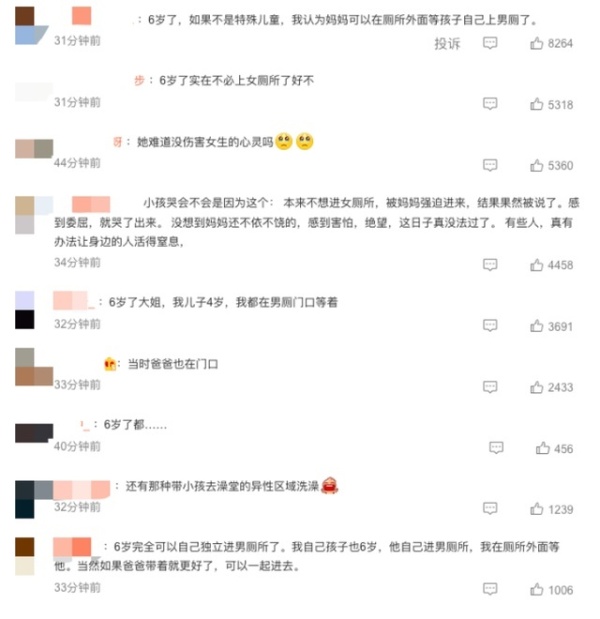 此消息登上热搜后,迅速引起网友热议,“6岁了,如果不是特殊儿童,我认为妈妈可以在厕所外面等孩子自己上男厕了”,“她难道没伤害女生的心灵吗”,“6岁了大姐,我儿子4岁,我都在男厕门口等着”。