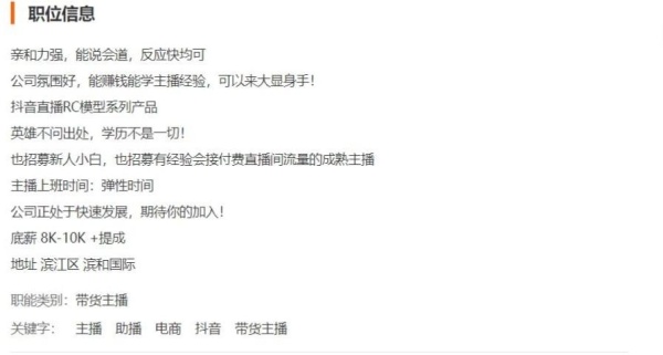经九派新闻查询发现,在某招聘平台上已检索不到该公司,但在另一家招聘平台却能检索成功。目前,该公司仍在招聘带货主播,其招聘内容称:“不限经验,直播RC模型系列产品,底薪8K—10K+提成。”