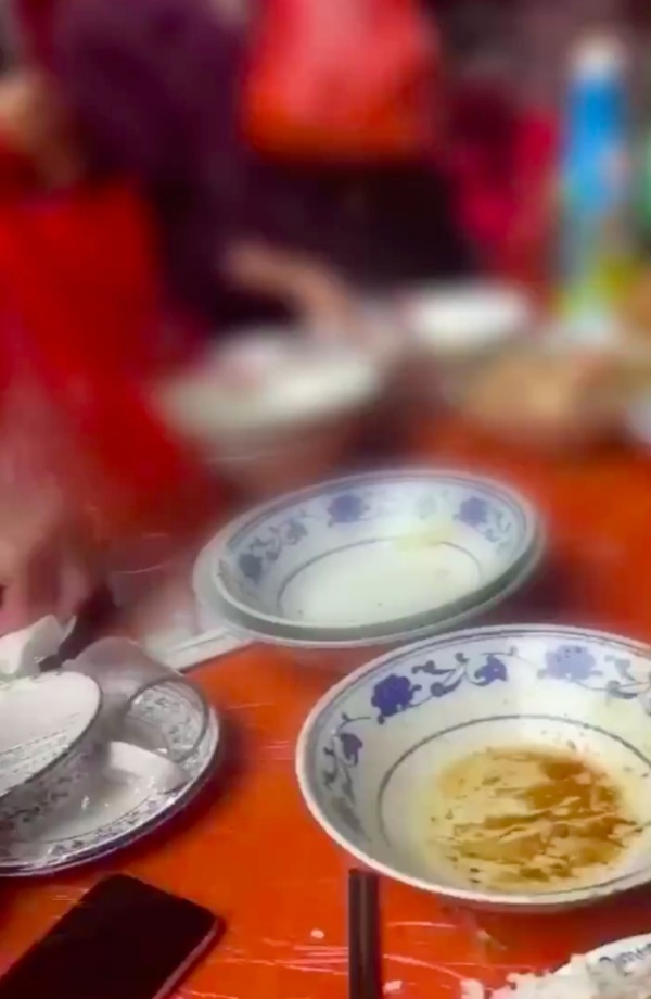 视频中,几个大妈把菜都倒进了塑料袋,只留下一些空空的碗。