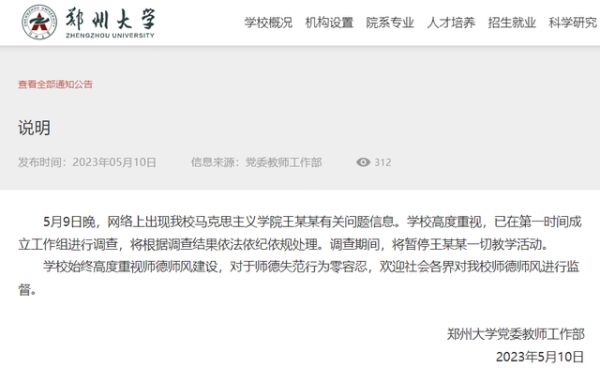 近日,有网友爆料称自己在11年前遭郑州大学一老师PUA长达两年半,遭侵犯致怀孕后还被其带去医院打胎。5月10日,郑州大学党委教师工作部发布说明称,5月9日晚,网络上出现该校马克思主义学院王某某有关问题信息。学校高度重视,已在第一时间成立工作组进行调查,将根据调查结果依法依纪依规处理。调查期间,将暂停王某某一切教学活动。
