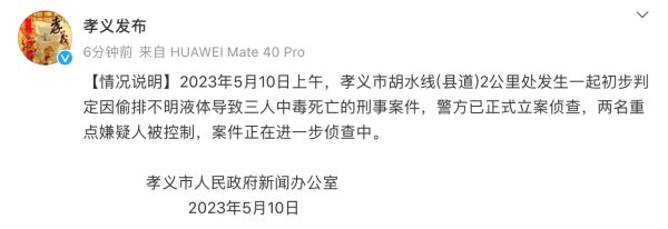 2023年5月10日上午,孝义市胡水线(县道)2公里处发生一起初步判定因偷排不明液体导致三人中毒死亡的刑事案件,警方已正式立案侦查,两名重点嫌疑人被控制,案件正在进一步侦查中。