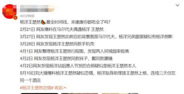 早在此前恋情瓜刚刚曝出的时候,已经有多条线索,关于杨洋和王楚然的恋情瓜始于2月份,当时有网友称偶遇杨洋王楚然同游马尔代夫,根据王楚然IP地址、自拍背景图等推测二人同在马尔代夫,但没有具体同框照作为证据。