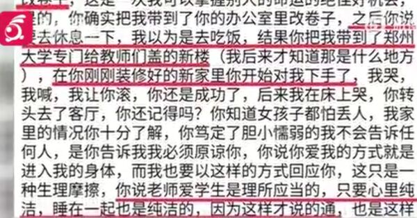 5月10日,据百姓关注报道,近日,有网友在社交平台上发文指控郑州大学一老师在11年前侵犯了她,并致她怀孕后打胎。